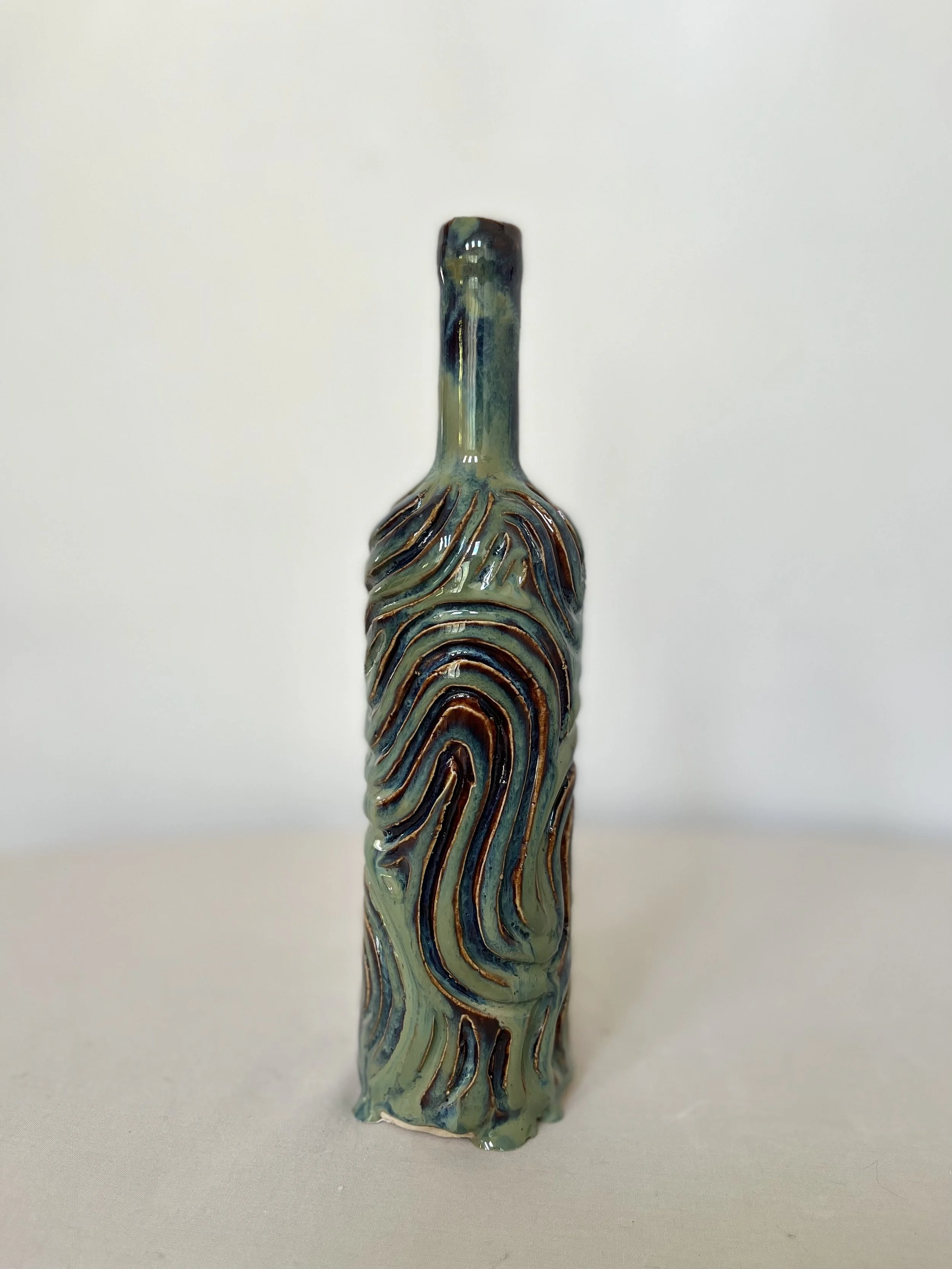 My client wanted to expand his personal collection of decorative non functional ceramic wine bottles. I decided the most efficient way to create around 30 wine bottles is to create a two part plaster mold of a glass wine bottle. Then I created around 50 test tiles with varying textures and glaze combinations so my client had a large selection to choose from. It was such a fun project where I got to experiment with a variety of textures using slip trailing, carving, and distorting the original shape of the wine bottle. I also wasn’t limited to glazes that were exclusively food safe. I used techniques like bubble glazing, splatter glaze, abstract brush strokes, and glaze chips.